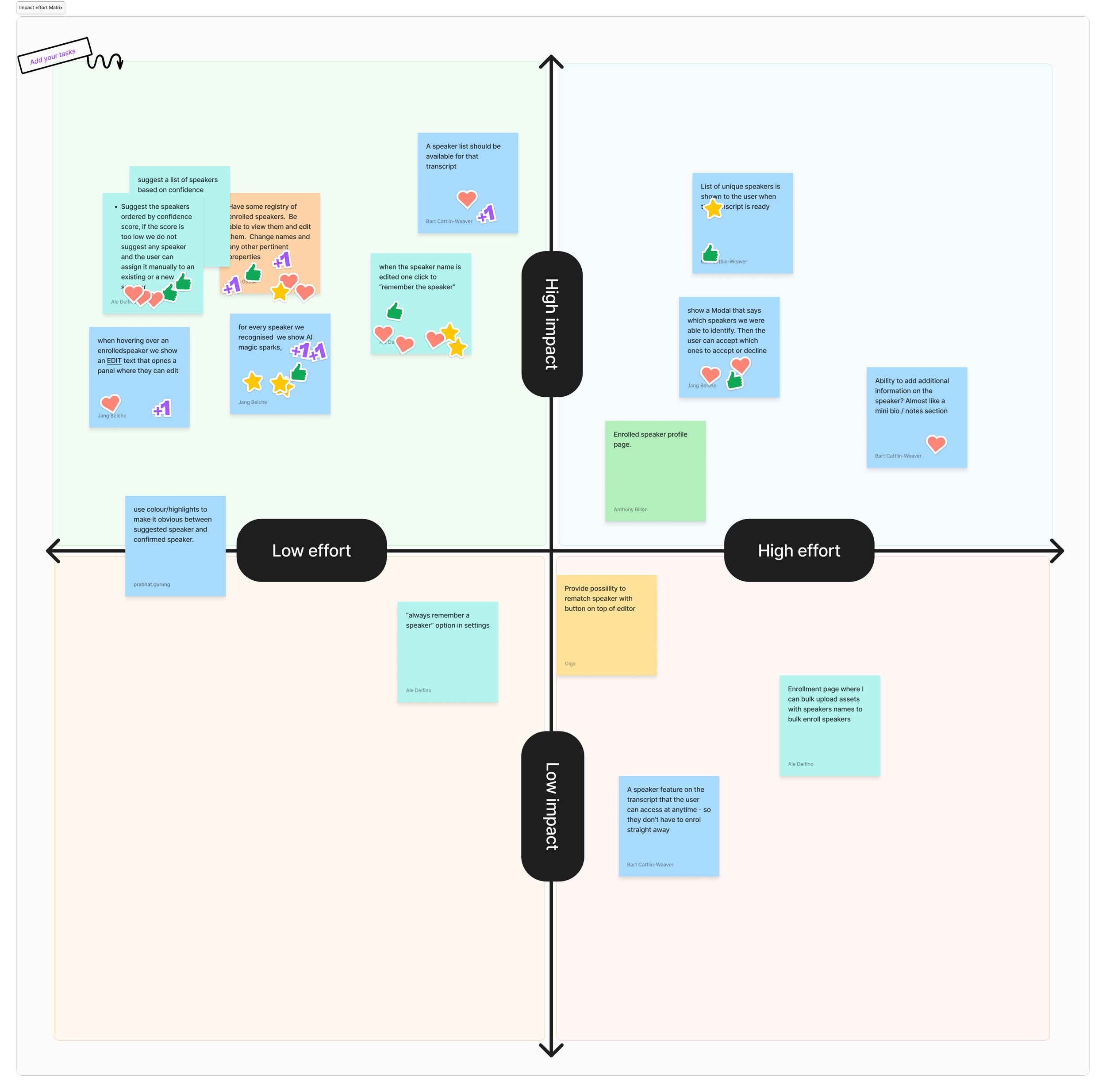 These job stories clarified the problem space, prioritised scope, and shaped a realistic roadmap. Using How Might We prompts, we explored multiple solutions, then prioritised them using dot voting and an impact vs. effort matrix.