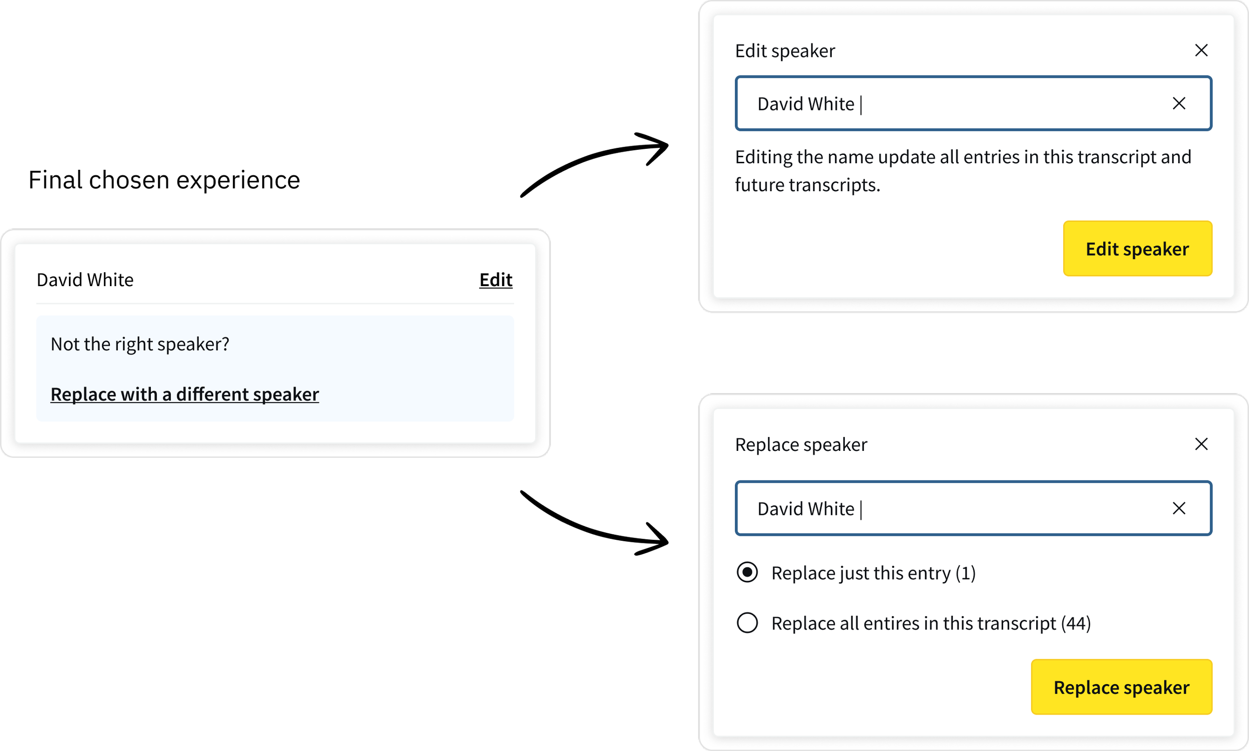‘Editing a known speaker’ and ‘correcting an attribution error’ appear similar, but represent fundamentally different user intentions. Without a clear distinction, users risked unintentionally overwriting saved speaker data when they simply meant to correct a transcript.