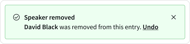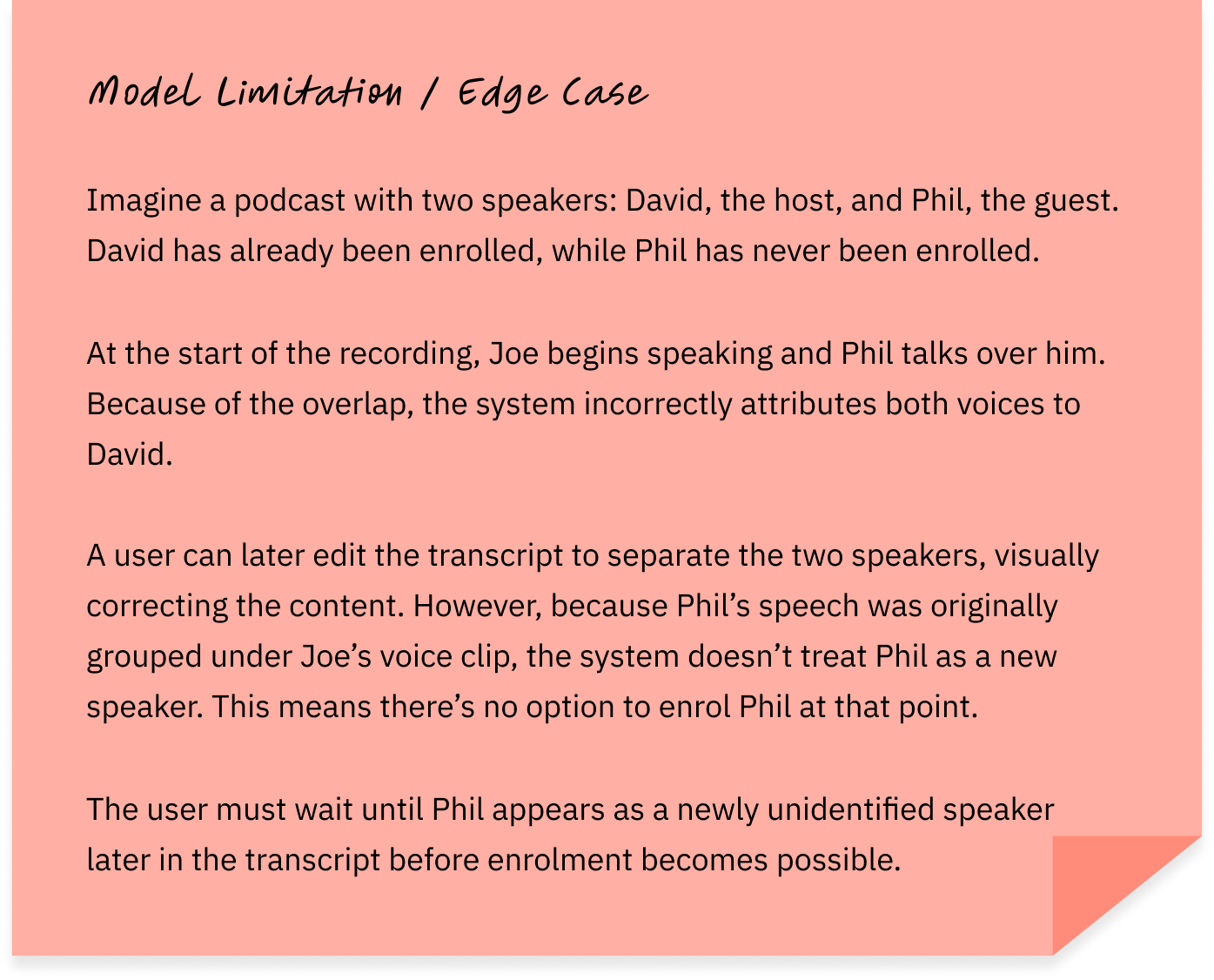 To make this distinction explicit, I separated these actions through a dedicated UI state when a recognised speaker name was present. This reinforced the mental model that users were either managing a known speaker or correcting an error, reducing ambiguity and protecting enrolled speakers.