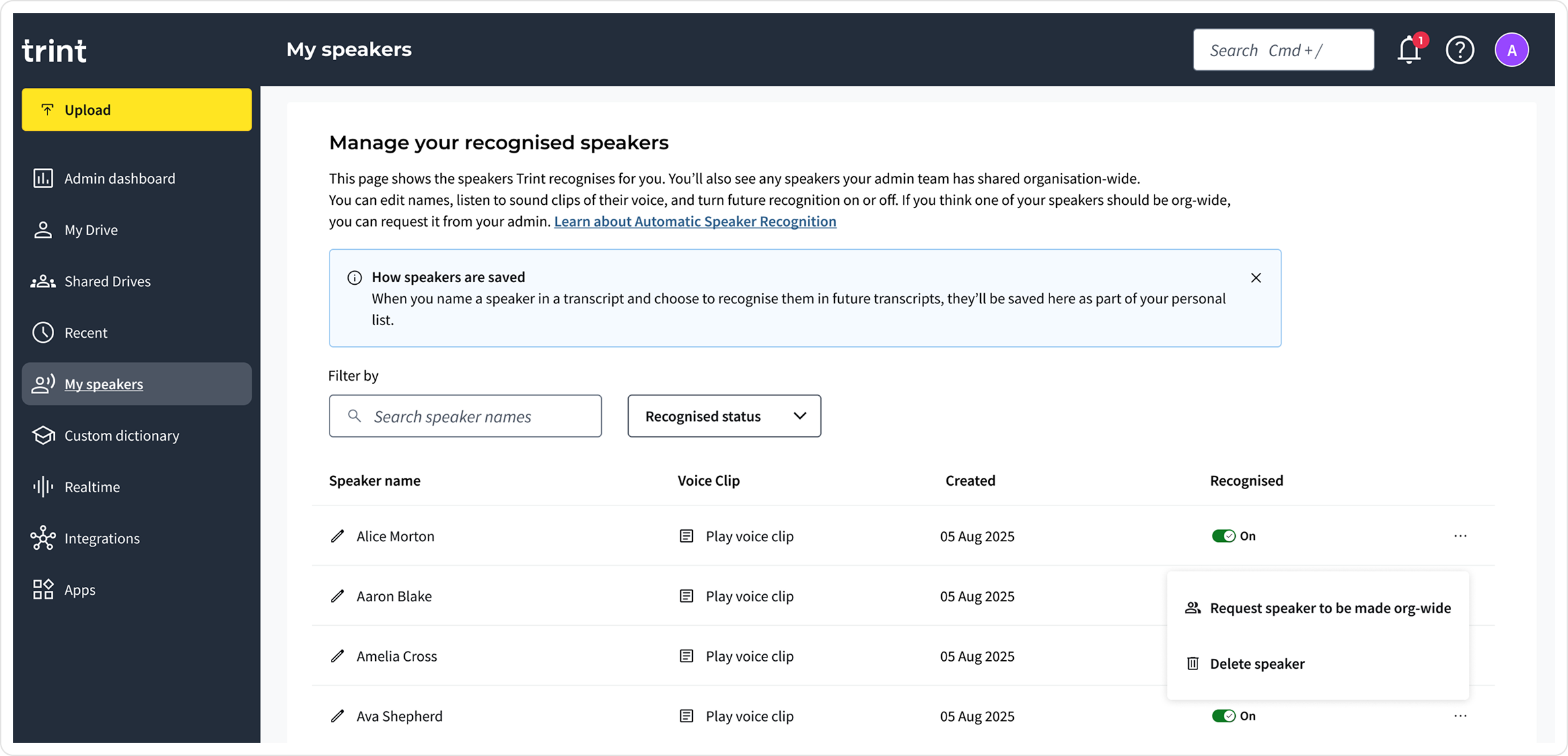 Admin users, however, could allow specific speakers (e.g., anchors or reporters) to be recognised organisation-wide. This created a scalable model, private when it needed to be, shared when it added value.