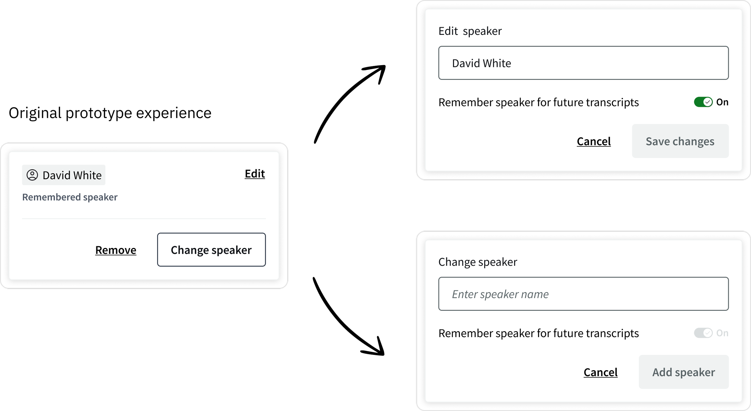 While designing the end-to-end flow, this area quickly emerged as one of the most cognitively demanding parts of the experience. During usability testing, it was consistently the point where participants asked the most questions around the difference between editing a speaker label, changing a speaker, and what impact those actions had on future transcripts and saved data.