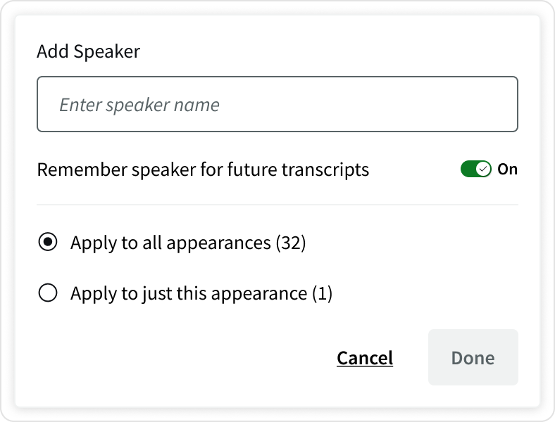 Defaulting “remember speaker” to ON would artificially boost usage and create cleanup work when unwanted speakers were saved. Testing and client feedback showed remembering speakers is an intentional action, not a default. Early copy referencing ‘future transcripts’ caused confusion, with testers interpreting this as future uploads. Simplifying the language to “future use” removed ambiguity and aligned expectations.