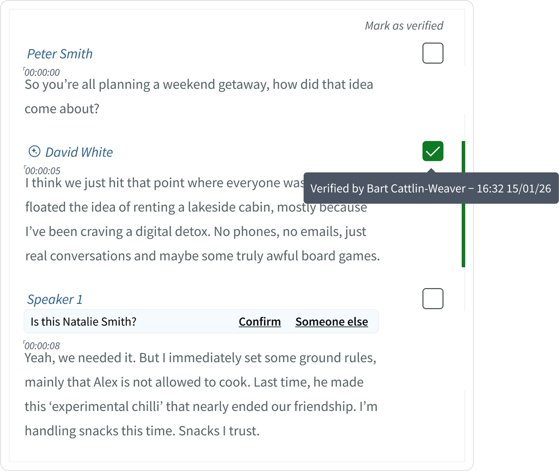 I added a subtle verification checkbox users could click to verify the both the speaker label and transcribed text. On hover, it showed who reviewed it and when. This added trust and accountability without adding friction. Users could see, at a glance, what was human-checked versus AI-suggested.