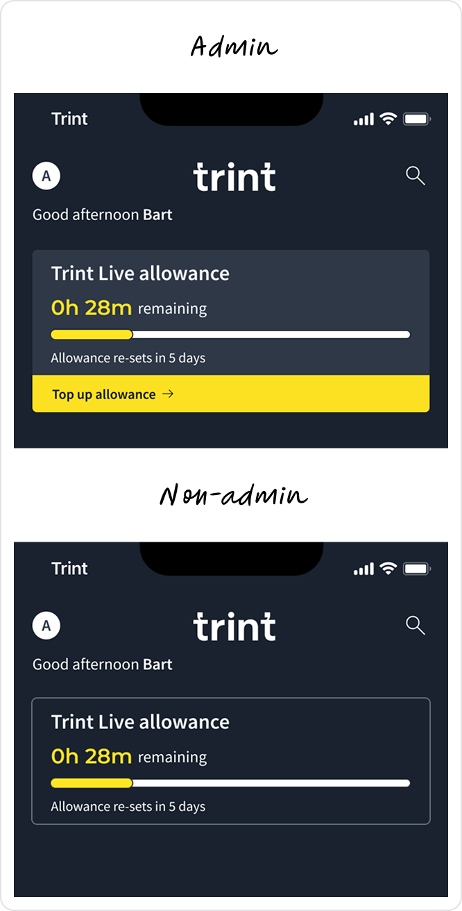 If allowance fell below a threshold Admin’s were given a clear ‘Top up allowance’ CTA, while non-admins received an informative message, prompting them to speak to their admin. To reduce reliance on internal communication, I also proposed an automated email alert to notify admins when allowances ran low.