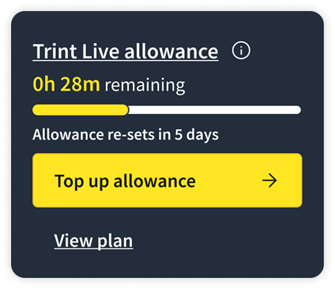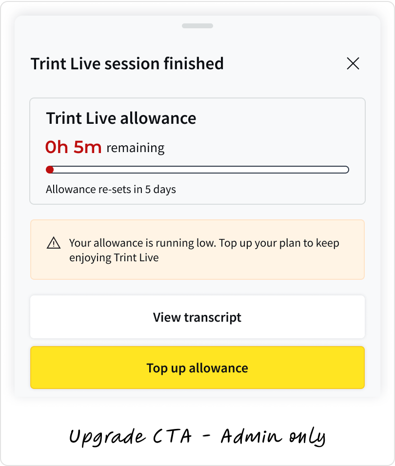Admin view - Elevated, tappable card with clear CTA to top up and relevant usage and feature information.