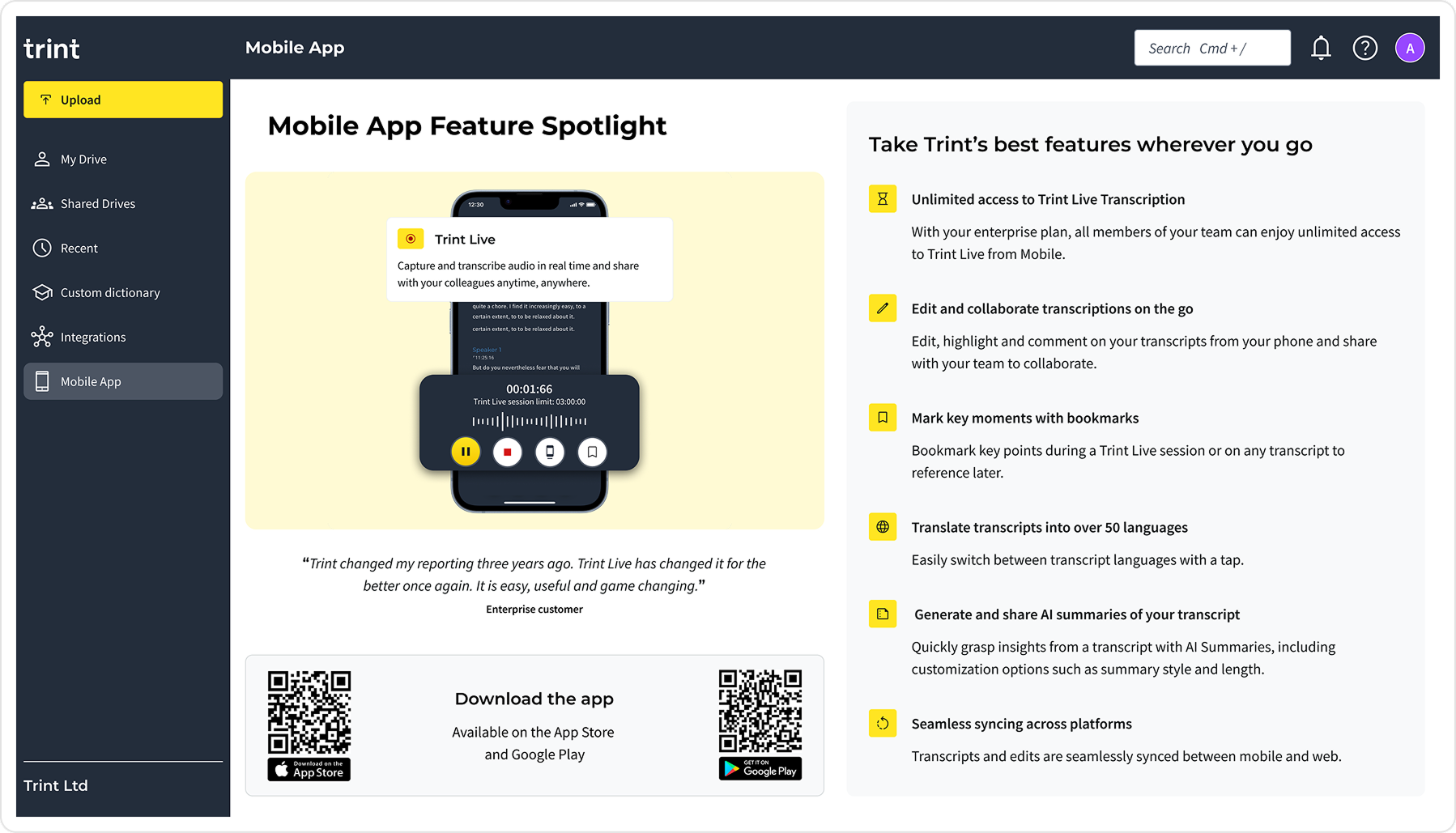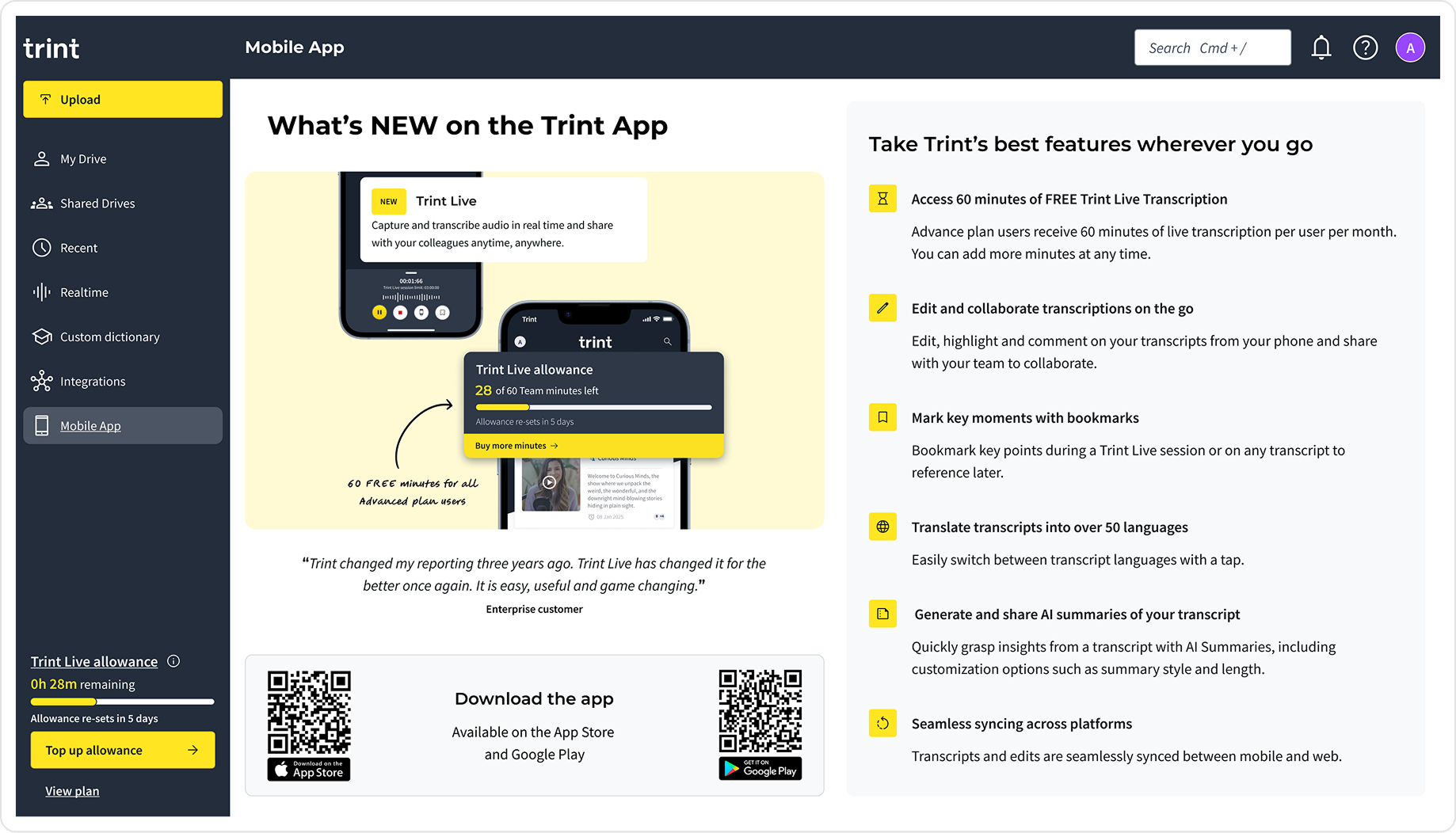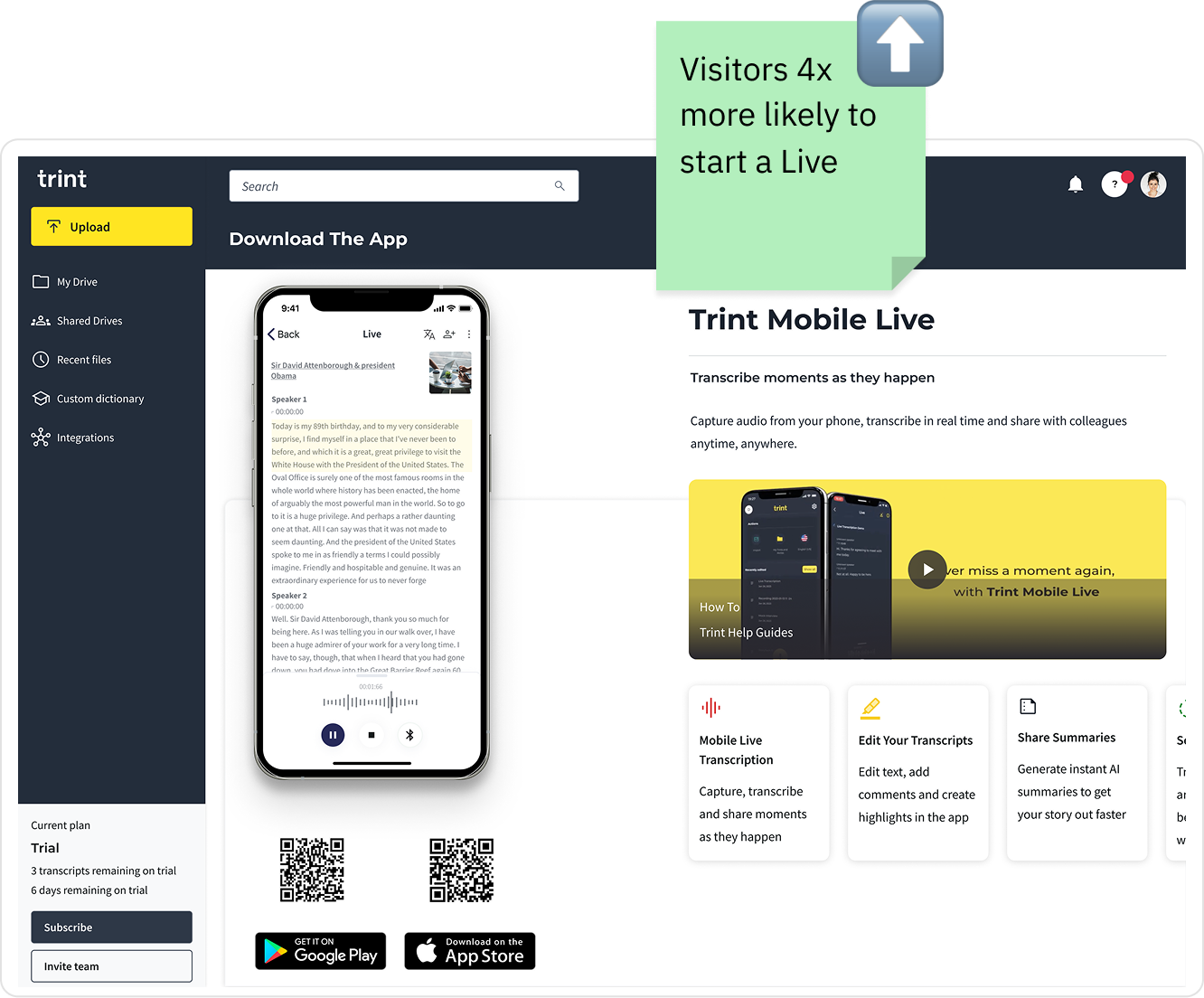 We reused this approach to promote Trint Live, adding a card to the web dashboard that linked directly to the mobile app page, a channel already performing well for converting awareness into app downloads.