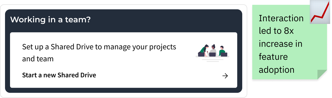 In a previous project I had designed a dashboard announcement card that had an 8x increase in Shared Drive creation.