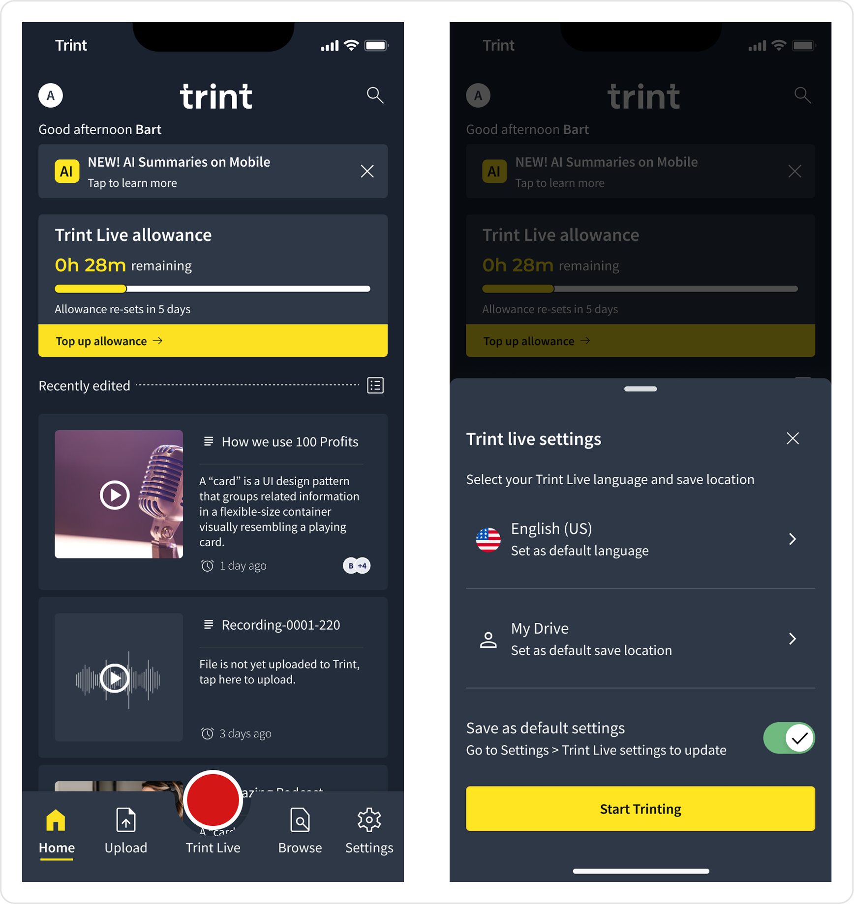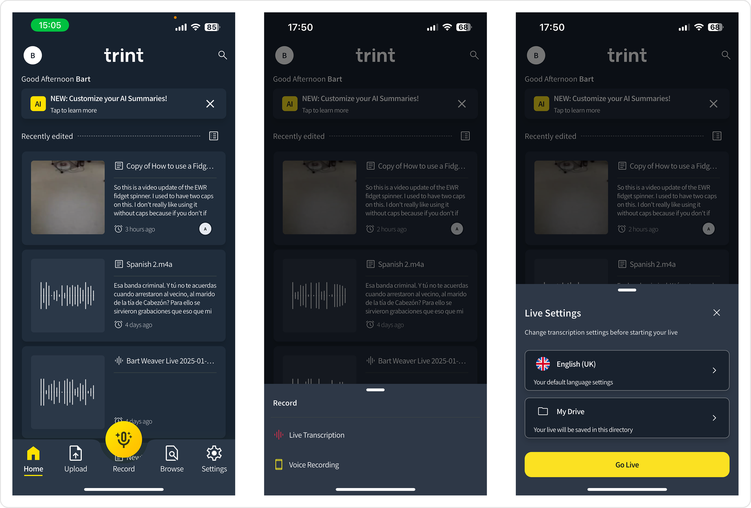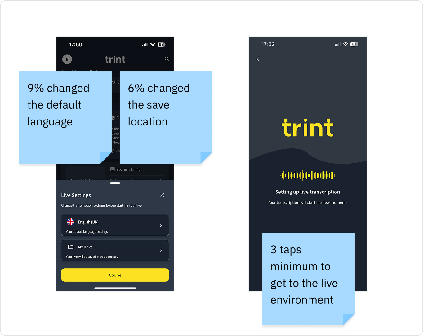 Trint Live was buried in the standard recording flow, requiring multiple taps to get to the Live environment. Enterprise users flagged that in high-pressure environments speed was critical for journalists to access the feature.