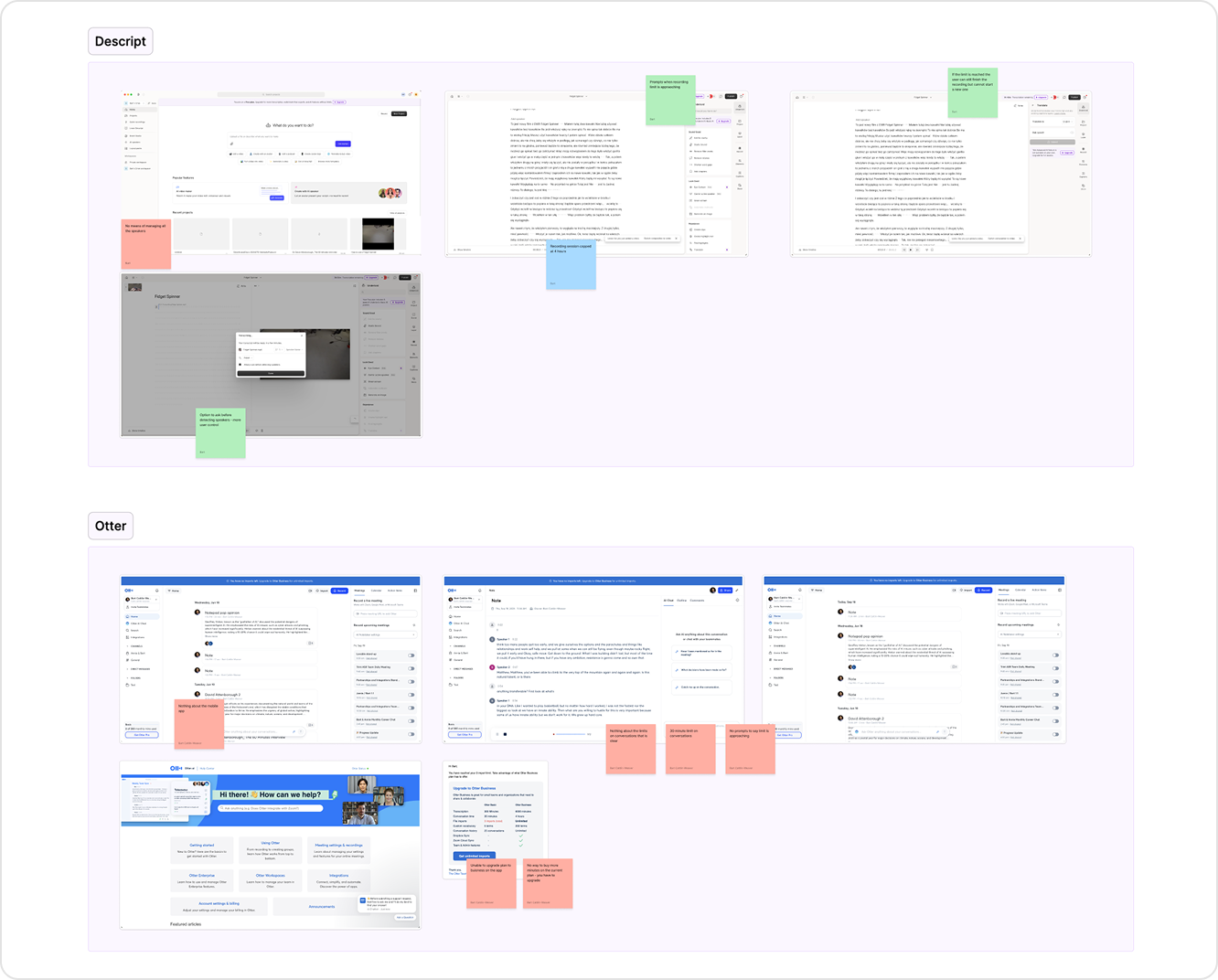 I reviewed live transcription experiences across competitor tools, focusing on how usage limits were communicated and how upgrade flows were triggered.