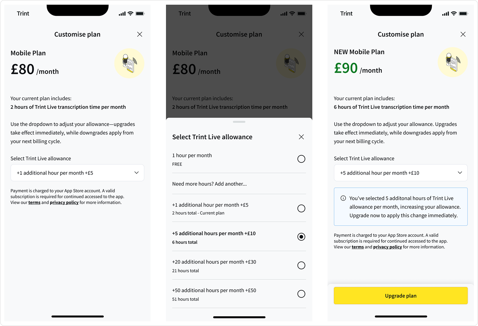I designed a new in-app upgrade flow to clearly show how additional Live minutes affected a user’s plan.
