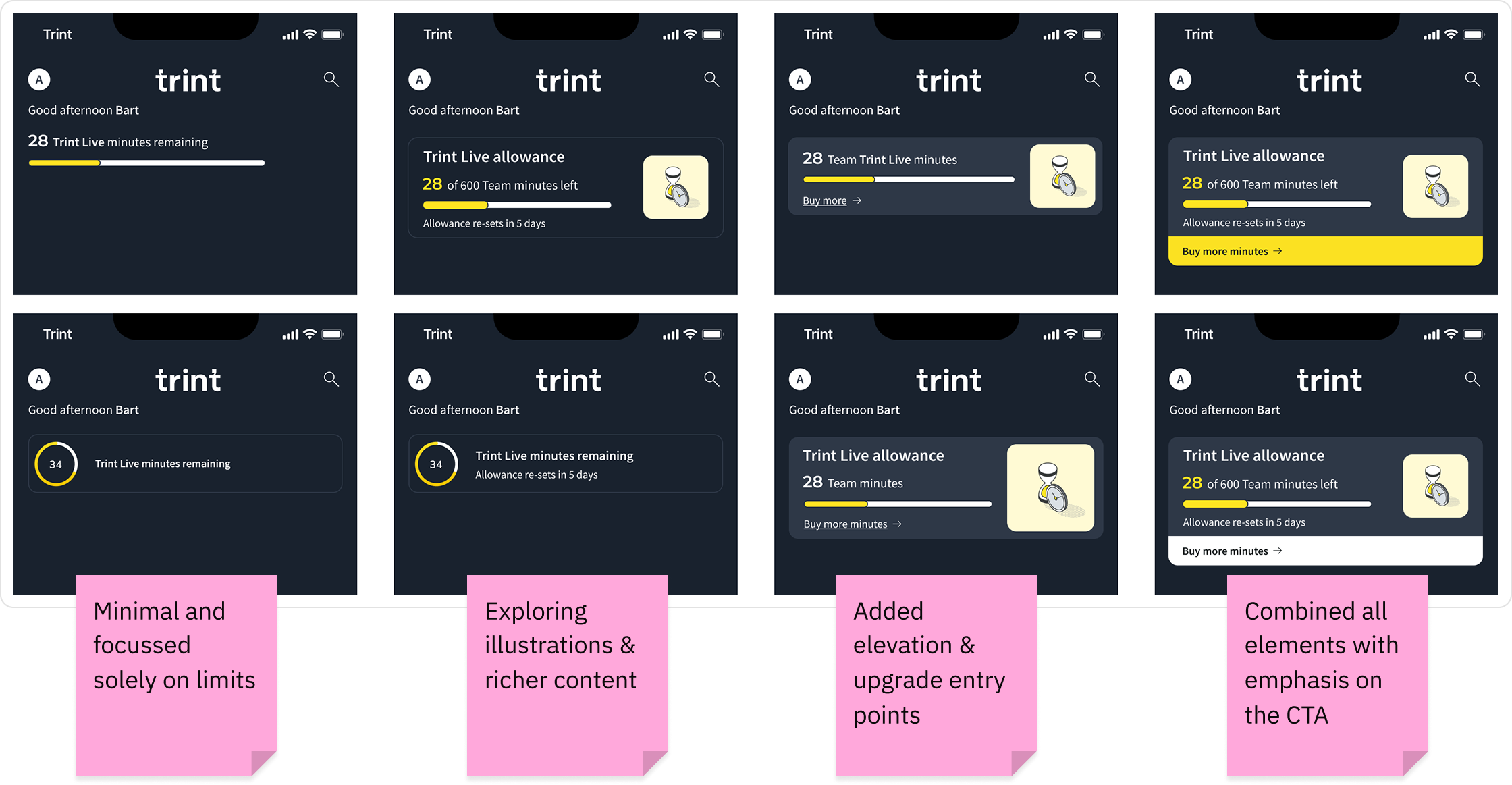 Ensured remaining minutes were clear and scannable while giving appropriate visual hierarchy to additional information and upgrade CTA. User feedback suggested that the information heavy card was more informative and useful than the minimal design.